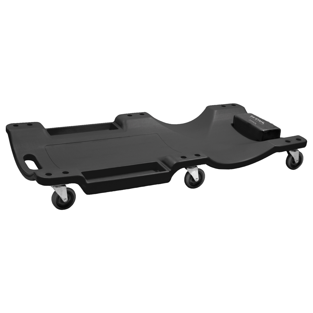 en plastique, ergonomique, avec rangements latéraux pour petites pièces.
