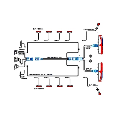 Composizione del kit 2 fanali posteriori LC8T, 2 luci d’ingombro DX con cavo click-in 600 mm, 2 luci targa EPP96 ADR con cavo click-in 410 mm, 8 side-marker LED SMD04 staffa 90° con cavo click-in 1500 mm, 2 luci d’ingombro LED anteriori SMMD04 con cavo click-in 1000 mm., Sistema RSC con cavo da 16 m con cavi piatti laterale di 16 m, adattatore posteriore 2 m, adattatore anteriore 3 spine