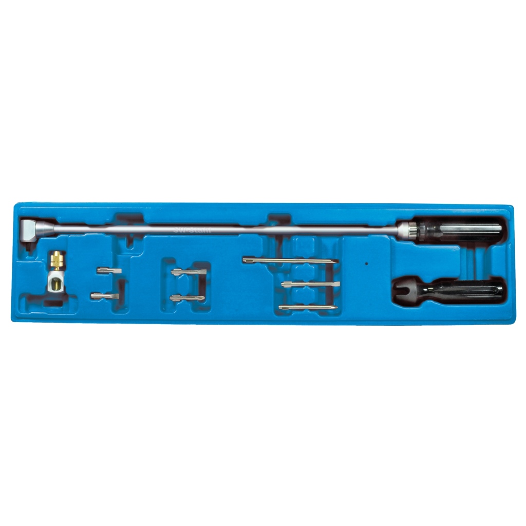 mit 90° Umlenk-Kegelradgetriebe zur präzisen Einstellung schwer zugänglicher Luft- oder Gemisch-Einstellschrauben z.B. bei Motorradvergasern, die sonst eine zeitaufwendige Demontagearbeit zur Folge hätte. Getriebeübersetzung 1:1 (eine Umdrehung am Handgriff gleich einer Umdrehung der Schraube).